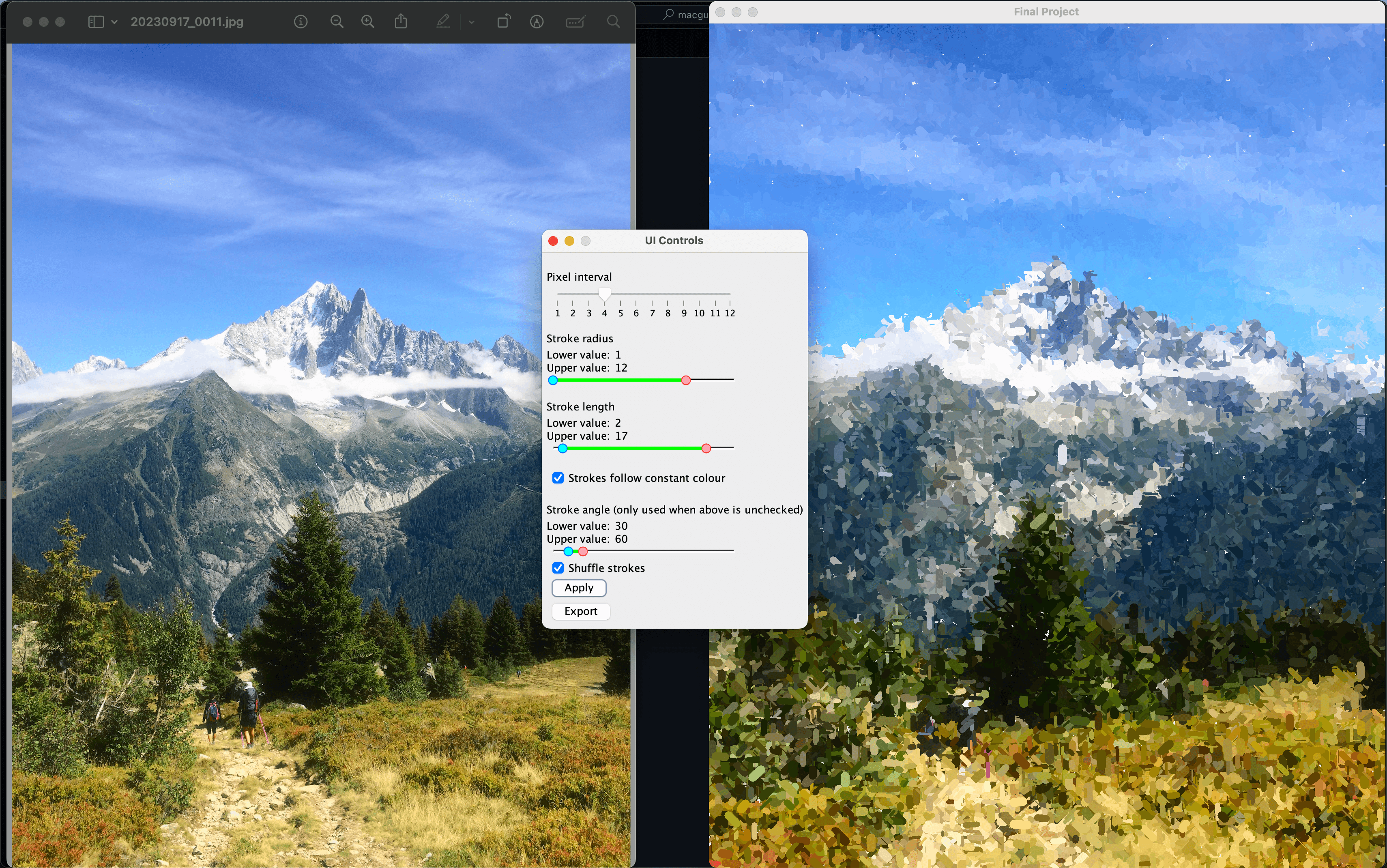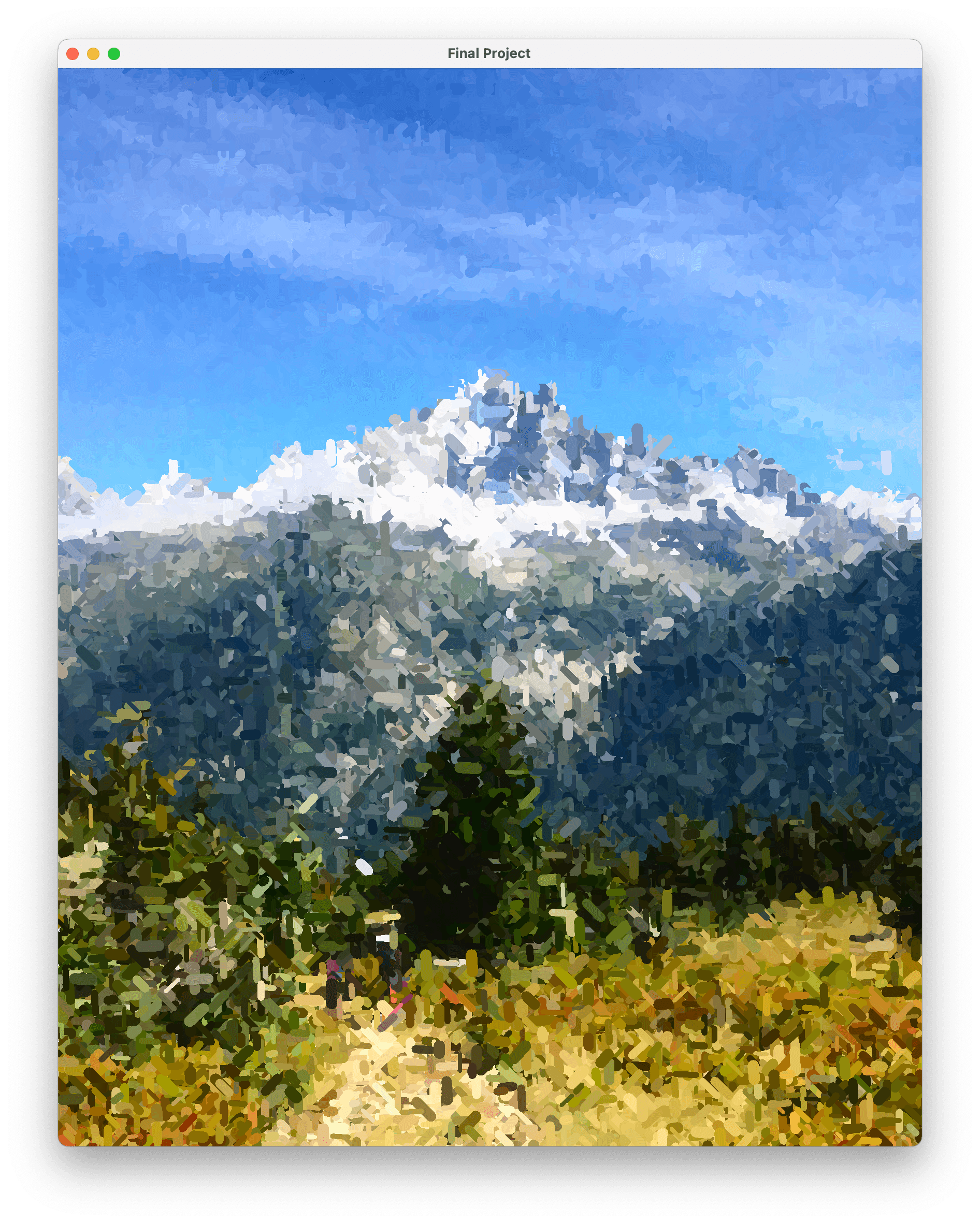 Impress lets users create digital impressionist "paintings" of their photos. It uses an adaptation of Peter Litwinowicz' image processing algorithm described in Processing Images and Video for An Impressionist Effect. The project was completed as part of IAT 455: Computational Media at SFU SIAT.